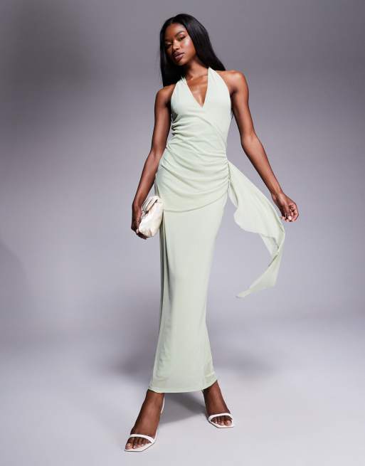 ASOS DESIGN – Neckholder-Midikleid aus Mesh in Salbeigrün mit markanter Schärpe am Rock