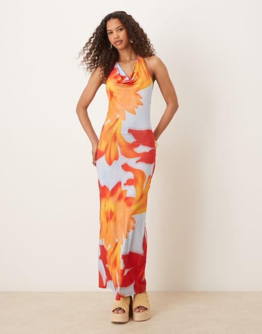 ASOS DESIGN – Neckholder-Midikleid aus Netzstoff in Orange mit tiefem Ausschnitt und aufgeblasenem Hibiskusprint