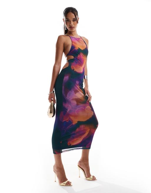 ASOS DESIGN – Neckholder-Midikleid mit extremem Zierausschnitt am Rücken und leuchtendem Blumenmuster