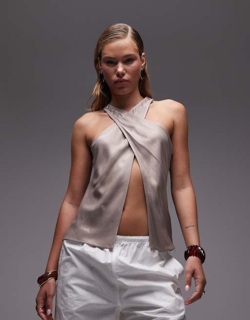 ASOS DESIGN – Neckholder-Oberteil in Pilzbraun aus Satin mit Wickel-Front