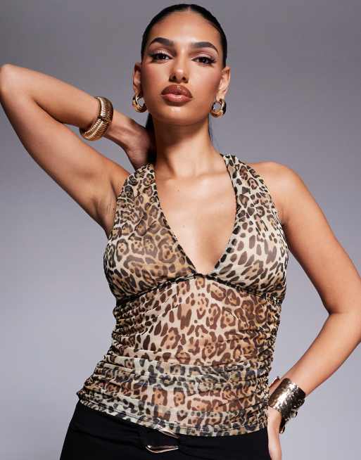 ASOS DESIGN – Neckholder-Top aus gerafftem Netzstoff mit Leopardenmuster und tiefem Ausschnitt