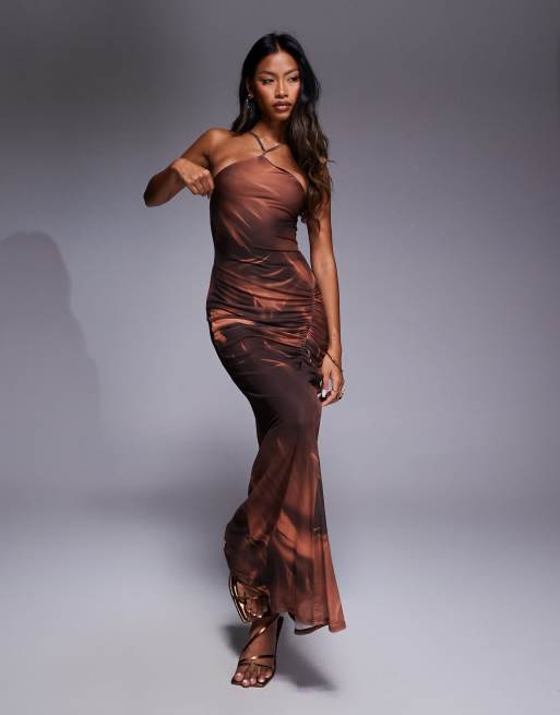ASOS DESIGN – Netzstoff-Maxikleid in Braun geblümt mit schmalem Neckholder-Träger