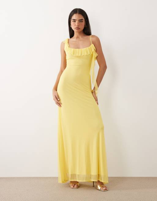 ASOS DESIGN – Netzstoff-Maxikleid in Zitronengelb mit asymmetrischem Rüschendetail und Bindedetail