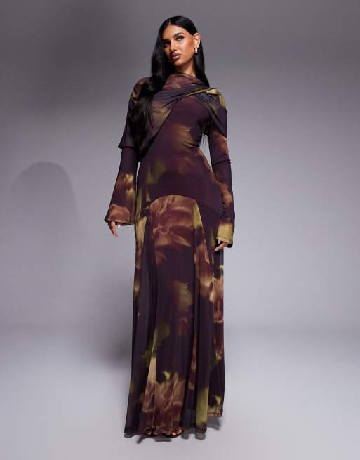 ASOS DESIGN – Netzstoff-Maxikleid mit drapiertem Ausschnitt mit Overlay und verschwommenem Blumenmuster