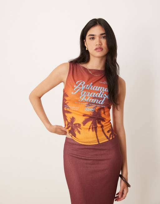 ASOS DESIGN – Netzstoff-Trägertop mit U-Boot-Ausschnitt und Bahamas-Palmen-Print