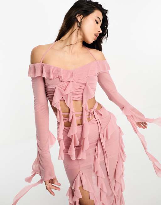 ASOS DESIGN – Oberteil aus Netzstoff in Zartrosa mit auffälliger Rüschenverzierung