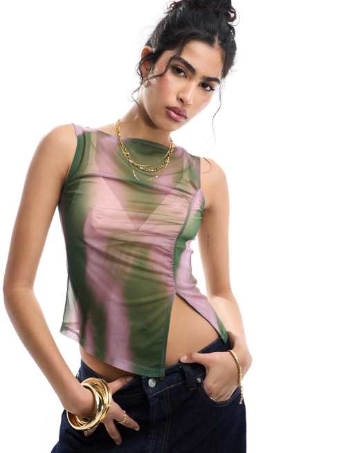 ASOS DESIGN – Oberteil aus Netzstoff mit Schlitz und Farbverlauf in Grün