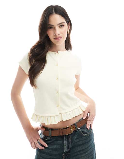 ASOS DESIGN – Oberteil in Buttermilchgelb mit Rüschendetail, Kappärmeln und Knopfleiste vorne