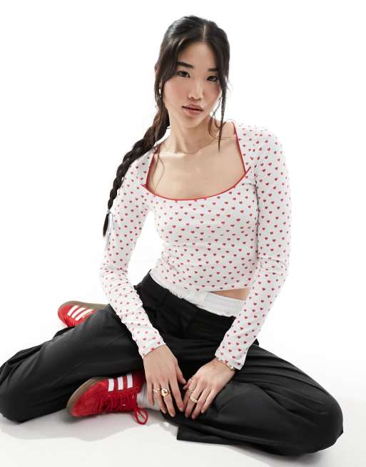 ASOS DESIGN – Oberteil in Elfenbein mit Herzausschnitt und Herzprint