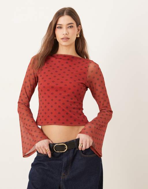 ASOS DESIGN – Oberteil in Rostrot mit Punktemuster, Netzstoff-Engelsärmeln und Rückenausschnitt mit Bindedetail