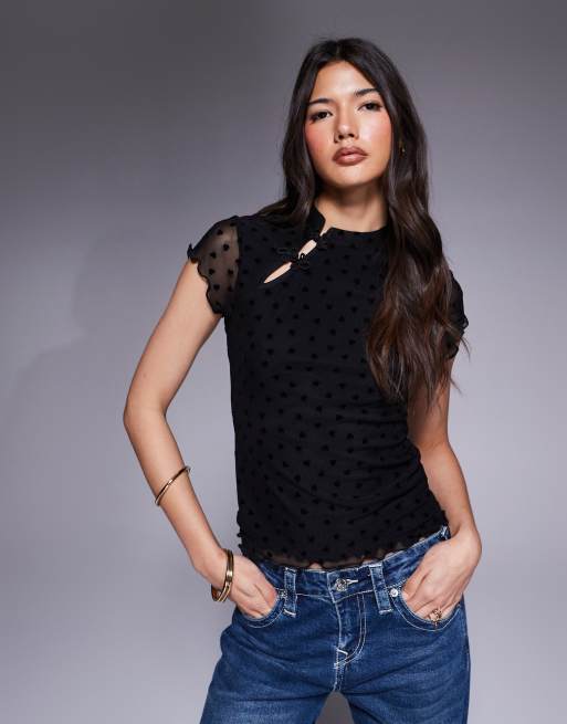 ASOS DESIGN – Oberteil in Schwarz mit Flügelärmeln und beflocktem Herzmuster