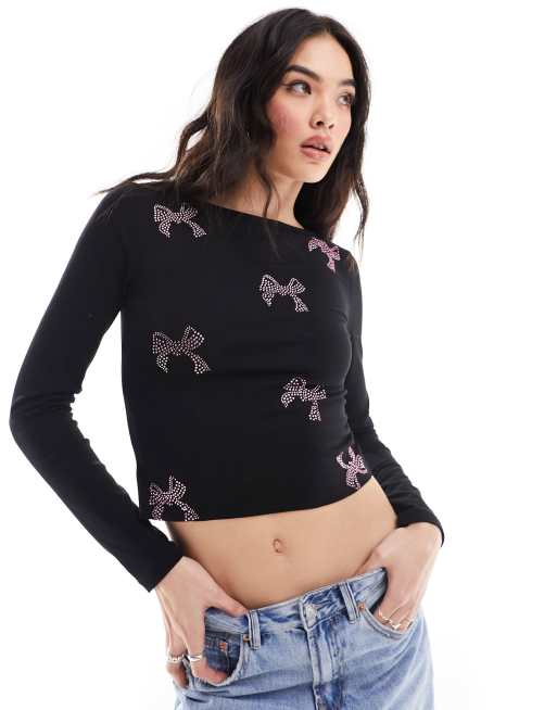 ASOS DESIGN – Oberteil in Schwarz mit rosa Strass-Schleifen