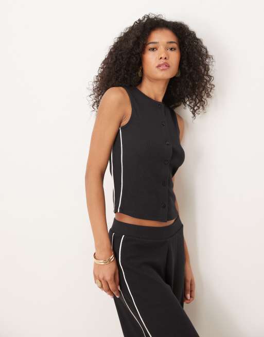 ASOS DESIGN – Oberteil in Schwarz mit Rundhalsausschnitt, durchgehender Knopfleiste und farblich abgesetzter Paspelierung, Kombiteil