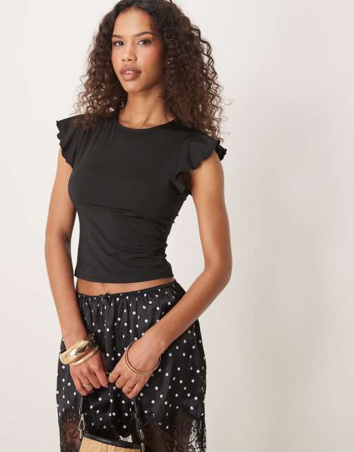 ASOS DESIGN – Oberteil in Schwarz mit U-Boot-Ausschnitt und Rüschenärmeln