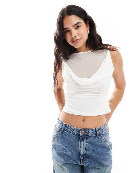 ASOS DESIGN – Oberteil in Weiß mit Netzstoff und Wasserfallausschnitt