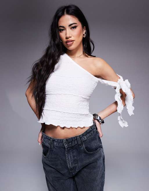 ASOS DESIGN – Oberteil mit gespleißter welliger Textur in Elfenbeinweiß mit seitlichem Bindeband