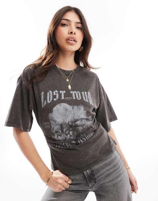 ASOS DESIGN – Oberteil mit Korsettbund und „Lost Tour Rock“-Grafik und durchgehendem Strassbesatz