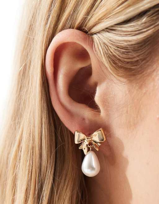 ASOS DESIGN – Ohrringe in Goldoptik mit kleiner Schleife und Kunstperlenanhänger
