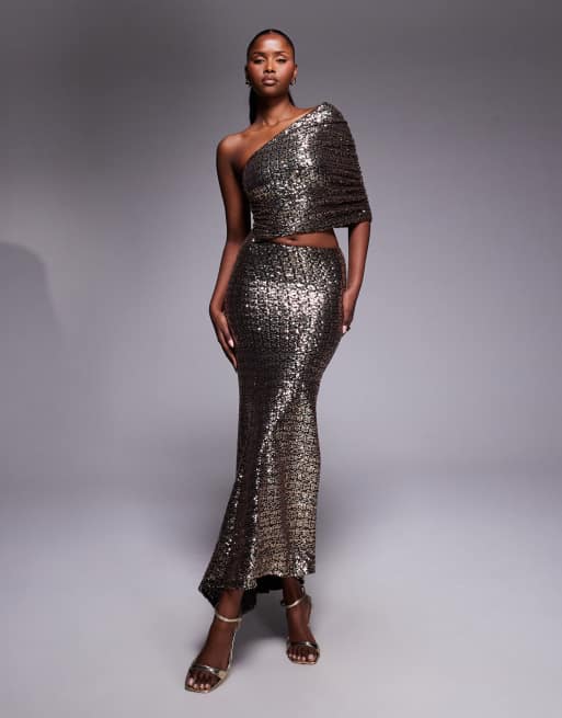 ASOS DESIGN – One-Shoulder-Maxikleid in Gold mit Pailletten und gerafftem Oberteil