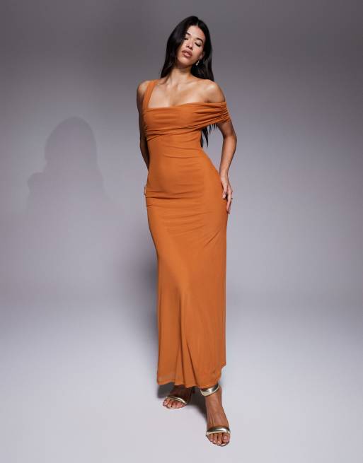 ASOS DESIGN – One-Shoulder-Midikleid aus Mesh in Ockergelb