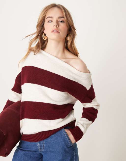 ASOS DESIGN – One-Shoulder-Strickpullover in Burgunderrot gestreift