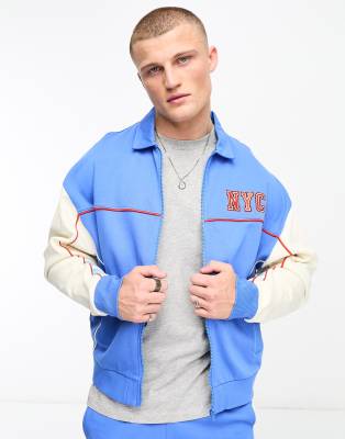 ASOS DESIGN – Oversize-College-Bomberjacke aus Jersey in Blau, Kombiteil