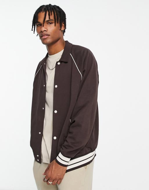 ASOS DESIGN – Oversize-College-Jacke in Braun mit Kontraststreifen