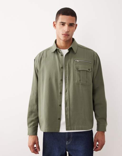 ASOS DESIGN – Oversize-Hemd aus Twill in Khaki mit Reißverschluss