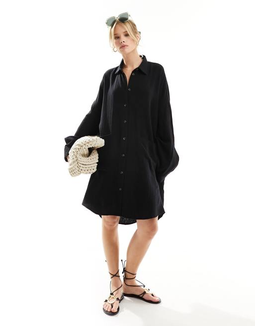 ASOS DESIGN – Oversize-Hemdblusenkleid aus Doppeltuchgewebe in Schwarz mit tiefsitzenden Taschen