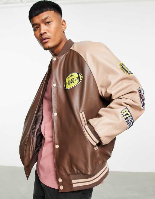 ASOS DESIGN – Oversize-Jacke im College-Stil aus echtem Leder in Braun