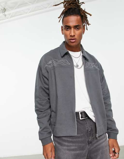 ASOS DESIGN – Oversize-Jerseyjacke in Grau mit Strassmotiv auf der Brust