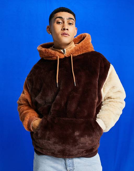 ASOS DESIGN – Oversize-Kapuzenpullover aus Kunstpelz mit Farbblock-Design in Brauntönen