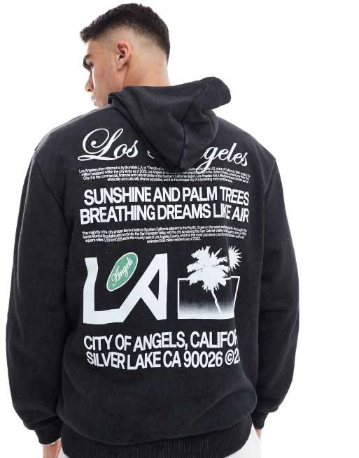 ASOS DESIGN – Oversize-Kapuzenpullover in gewaschenem Schwarz mit „Los Angeles“-Textprint