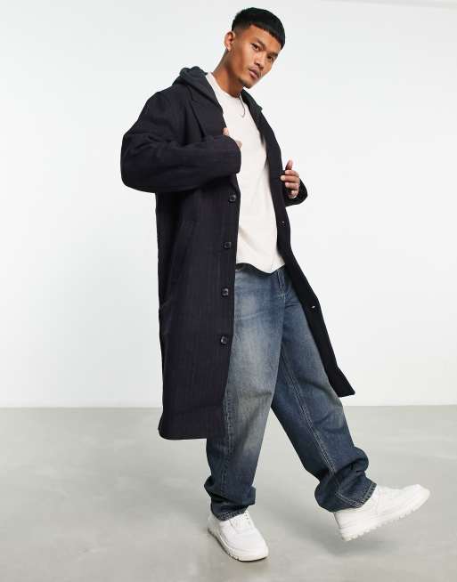 ASOS DESIGN – Oversize-Mantel aus Wollmischung in Marineblau mit Nadelstreifen und Kapuze in Kalkgrau