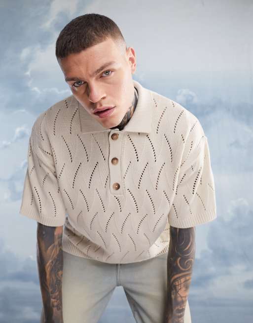 ASOS DESIGN – Oversize-Polohemd aus Pointelle-Strick in Steinbeige