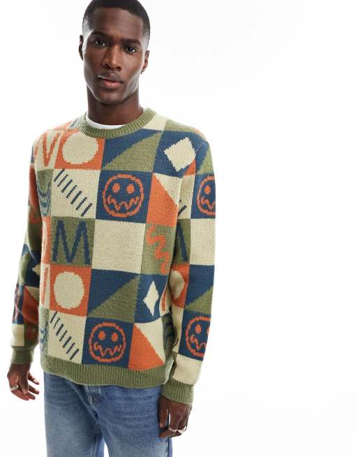 ASOS DESIGN – Oversize-Pullover aus angerautem Strickmaterial mit All-over-Print in Khaki und Orange