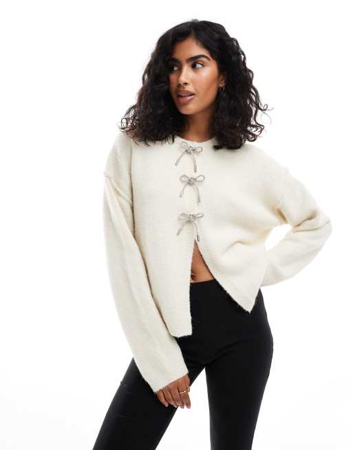 ASOS DESIGN – Oversize-Strickjacke in Creme mit Rundhalsausschnitt und strassbesetzten Schleifenknöpfen