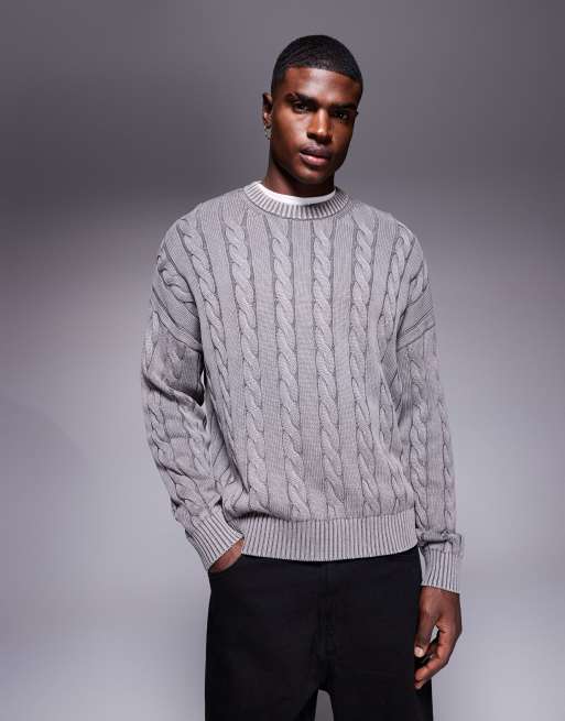ASOS DESIGN – Oversize-Strickpullover in verwaschenem Grau mit Zopfmuster