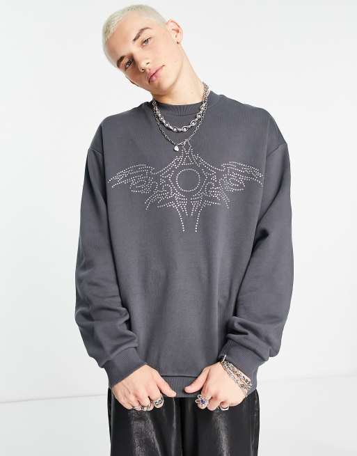 ASOS DESIGN – Oversize-Sweatshirt in Anthrazit mit Print mit Strassbesatz