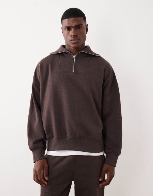 ASOS DESIGN – Oversize-Sweatshirt in Braun meliert mit überschnittenen Schultern und kurzem Reißverschluss am Kragen
