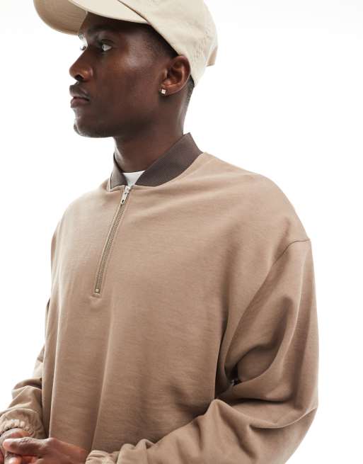 ASOS DESIGN – Oversize-Sweatshirt in Braun mit kurzem Reißverschluss und farblich abgesetztem Kragen