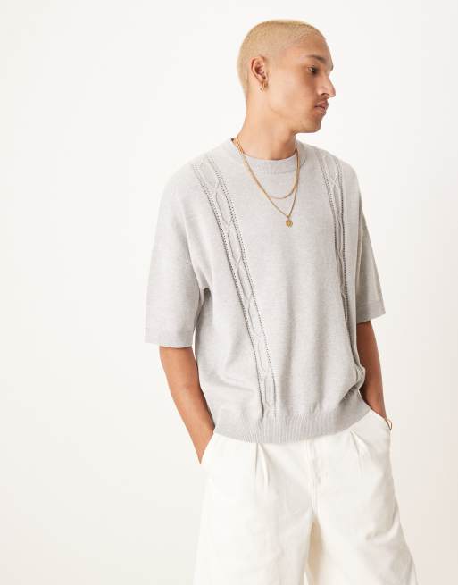 ASOS DESIGN – Oversize-T-Shirt aus Strick in Grau meliert mit Rundhalsausschnitt und Stickerei-Detail
