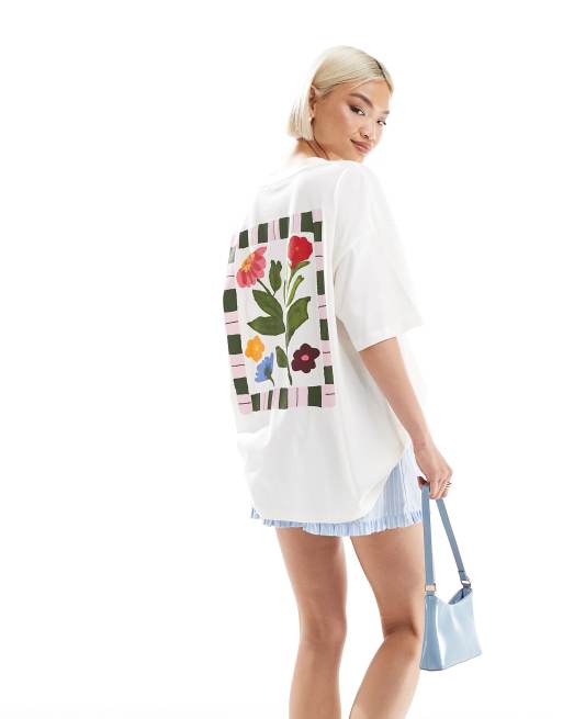 ASOS DESIGN – Oversize-T-Shirt in Creme mit floralem Grafikprint mit Streifenrand