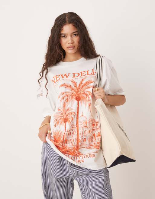 ASOS DESIGN – Oversize-T-Shirt in Cremeweiß mit verziertem „New Delhi“-Print