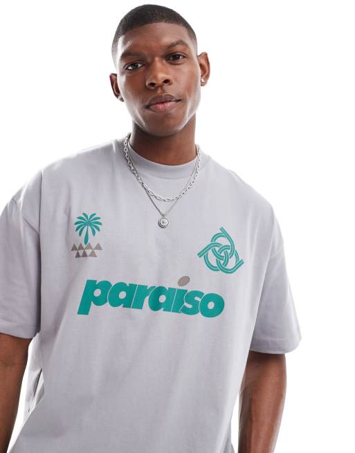ASOS DESIGN – Oversize-T-Shirt in Grau mit „Paraiso“-Print vorn
