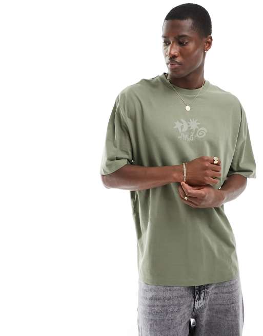 ASOS DESIGN – Oversize-T-Shirt in Khaki mit abstraktem Brust-Print