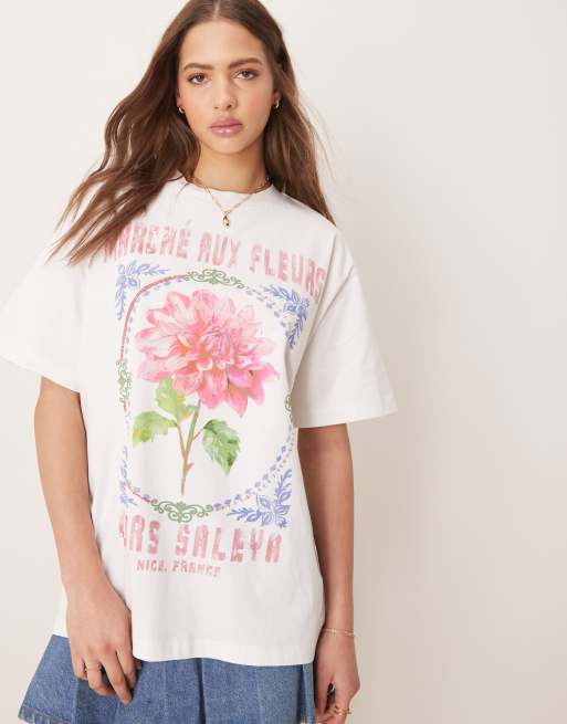 ASOS DESIGN – Oversize-T-Shirt in Kokosmilchweiß mit rosa Blumenprint