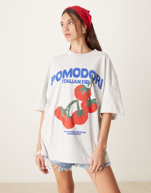 ASOS DESIGN – Oversize-T-Shirt in meliertem Eisgrau mit „Pomodoro“-Tomaten-Print
