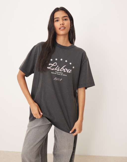 ASOS DESIGN – Oversize-T-Shirt in verwaschenem Anthrazit mit „Lisbon“-Grafik