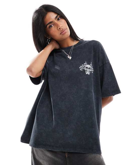ASOS DESIGN – Oversize-T-Shirt in verwaschenem Anthrazit mit Totenkopf- und Rennflaggen-Print mit Strassverzierung